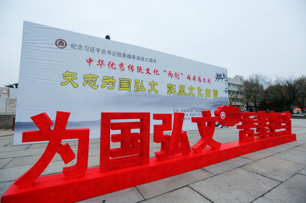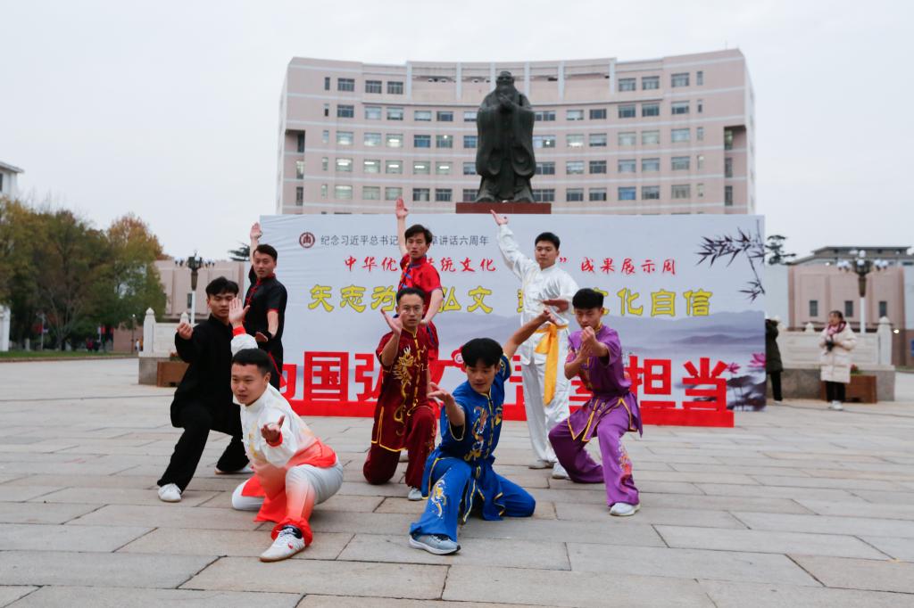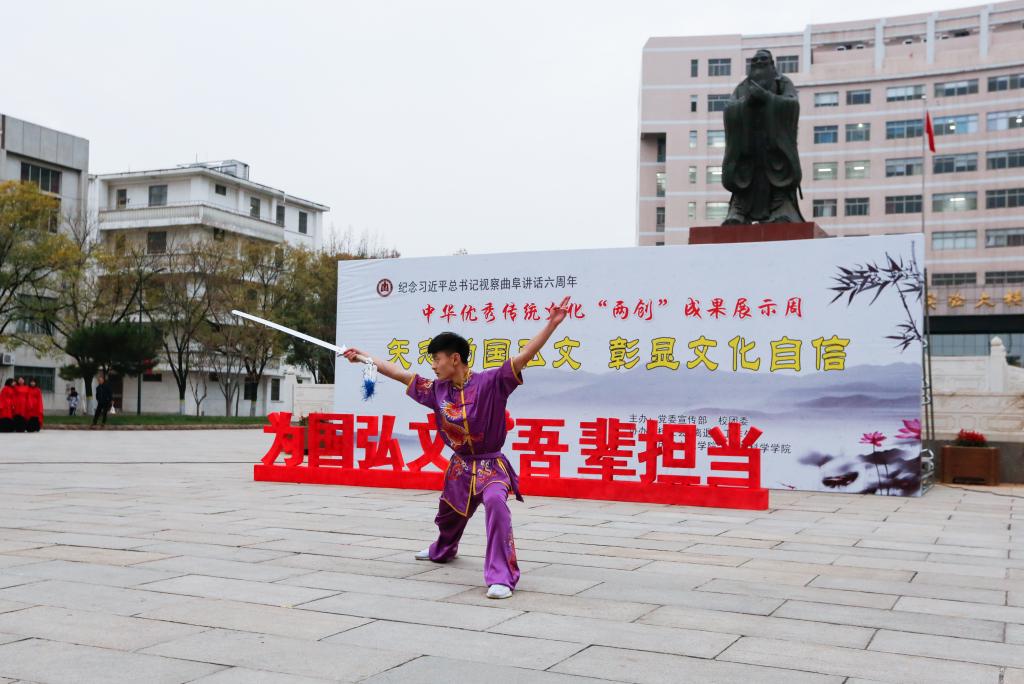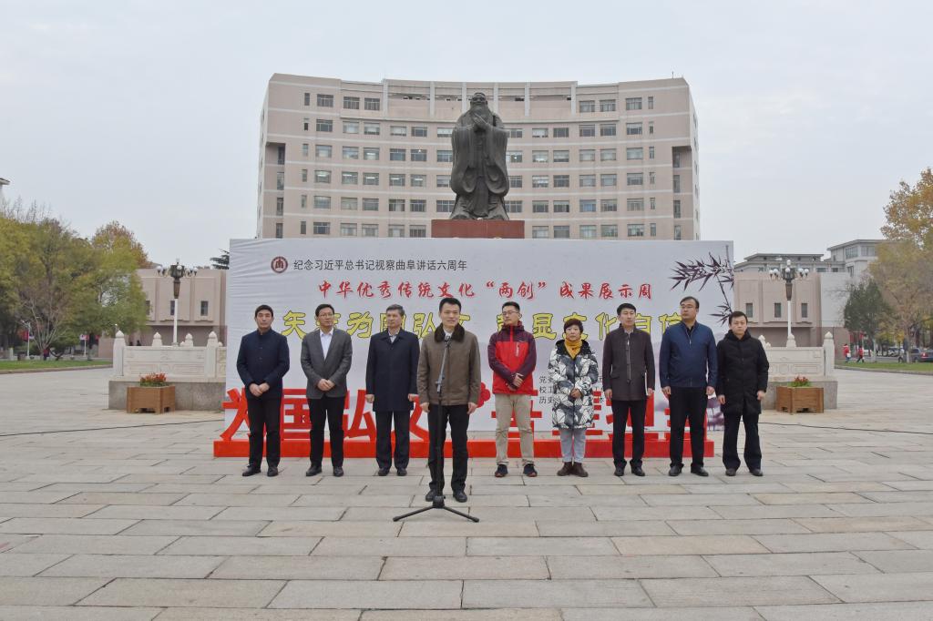 为纪念习近平总书记视察曲阜6周年重要讲话,推动落实“三亿网页版登录入口”战略,推进中华优秀传统文化在我校“创造性转化、创新性发展”,塑造以“韧性、睿性、德性”为核心的新时期曲园精神,我校党委宣传部、校团委、校工会、离退休工作处、历史文化学院、体育科学学院、书法学院等单位联合举办中华优秀传统文化“两创”成果展示周活动。11月26日下午,“两创”成果展示周活动开幕式在孔子文化广场举行。