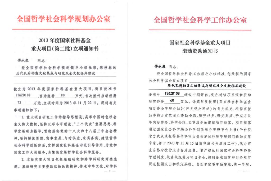 曲阜师大新闻中心讯(通讯员:姜修宪)近日,经全国哲学社会科学工作办公室批准,我校傅永聚教授主持的国家社会科学基金重大项目“历代孔府档案文献集成与研究及全文数据库建设”获得滚动资助经费60万元。该课题于2013年立项,是山东省属高校首个国家社科重大项目,也是我校首次获得滚动资助的重大项目。