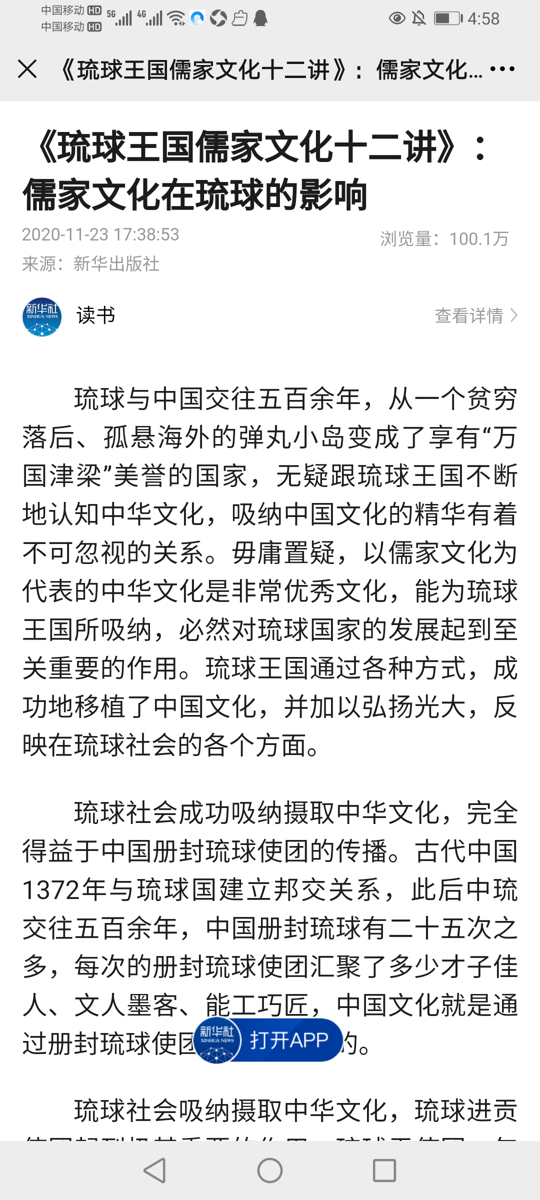 曲阜师大新闻中心讯 11月23日17时38分,新华社客户端“读书”栏目推出由曲阜师大东亚海域研究团队负责人孙晓光等编著的《琉球王国儒家文化十二讲》(新华出版社2020年9月版)一书,截止2020年11月24日18时,新华社客户端浏览量已达一百万人,说明曲阜师大东亚海域研究团队成果尤其是琉球问题研究成果,在海内外产生广泛影响。