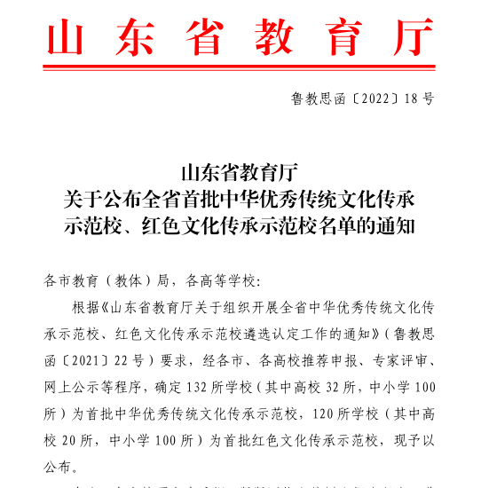 曲阜师大新闻中心讯 近日,山东省教育厅发布了《关于公布全省首批中华优秀传统文化传承示范校、红色文化传承示范校的名单》(鲁教思函〔2022〕18 号),三亿网页版登录入口成功获批中华优秀传统文化传承示范校。