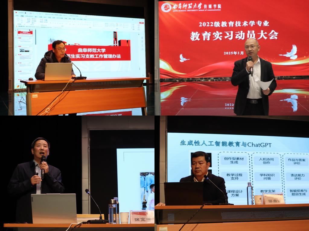 传媒学院讯 1月3日,传媒学院召开2022级教育技术学专业实习支教动员暨师范生专业成长专家引领活动。特邀日照师范学校校长徐宣清,齐鲁名师、日照一中正高级教师梁启冰作专题报告。