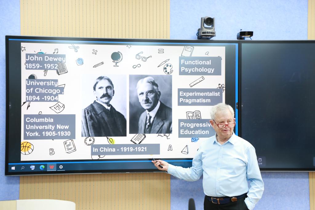 Waks教授在系列讲座中以深厚的学术造诣,系统梳理了杜威教育哲学的理论体系与发展脉络,解读了杜威思想的中国传播与当代价值。他指出,20世纪初,胡适、陶行知等学者将杜威思想引入中国,推动了“儿童中心论”对传统教育模式的革新。在当代教育改革中,杜威思想仍具深远影响,项目式学习的盛行、STEAM教育的推广以及“生活教育”理论的复兴,均体现了杜威“教育即经验改造”的核心理念。