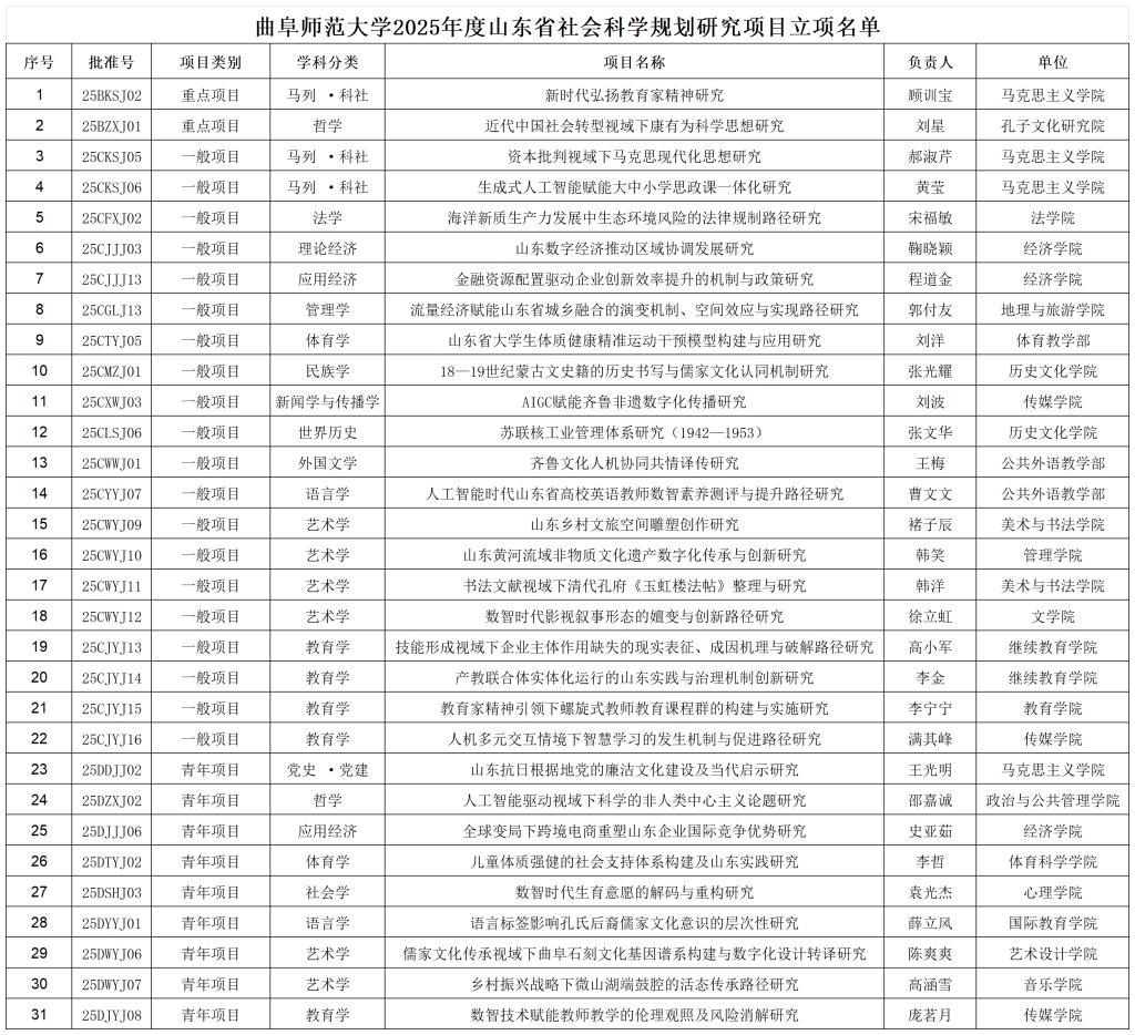 曲阜师大获批31项2025年山东省社科规划研究项目