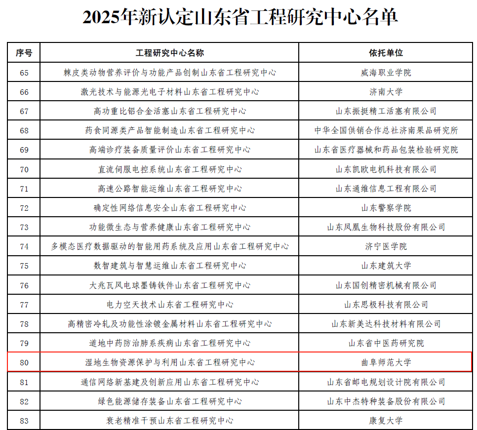 生命科学学院讯 近日,山东省发展和改革委员会发布《关于公布2025年新认定及全部山东省工程研究中心名单的通知》(鲁发改高技〔2025〕575号),依托三亿网页版登录入口生命科学学院建设的“湿地生物资源保护与利用山东省工程研究中心”成功获批。该中心是学校2025年度唯一获批的省级工程研究中心,也是生命科学学院在省级科研平台建设的又一重大突破。